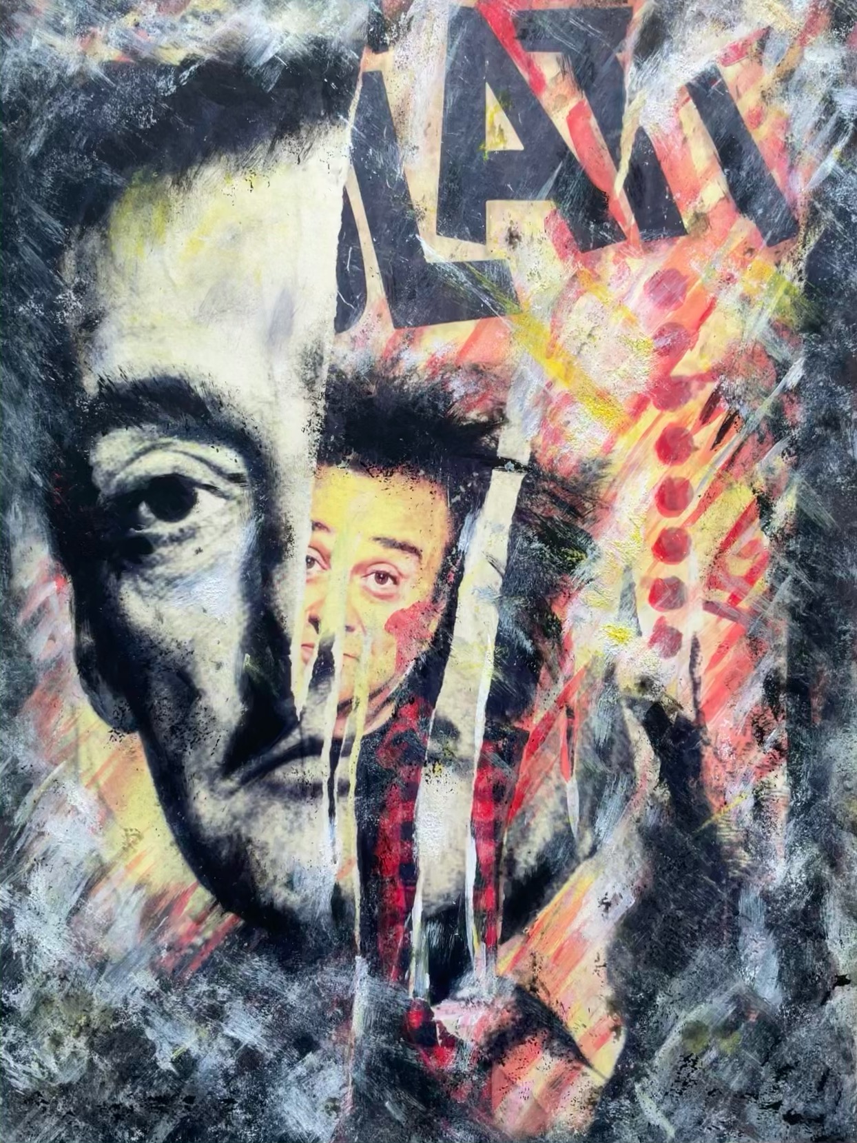 Colori acrilici, malta sabbiata, decollage, collage, foto impressione.